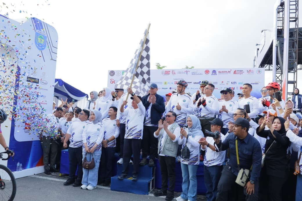 BANDING AGUNG – Gubernur Sumatera Selatan H. Herman Deru didampingi Bupati Ogan Komering Ulu Selatan Abusama, S.H., memlepas secara resmi Para Goweser Sriwijaya Ranau Gran Fondo (SRGF) Tahun 2025, Sabtu (15/11/2025). Bertempat di Plaza Icon Danau Ranau Kecamatan Banding Agung Kabupaten OKU Selatan
